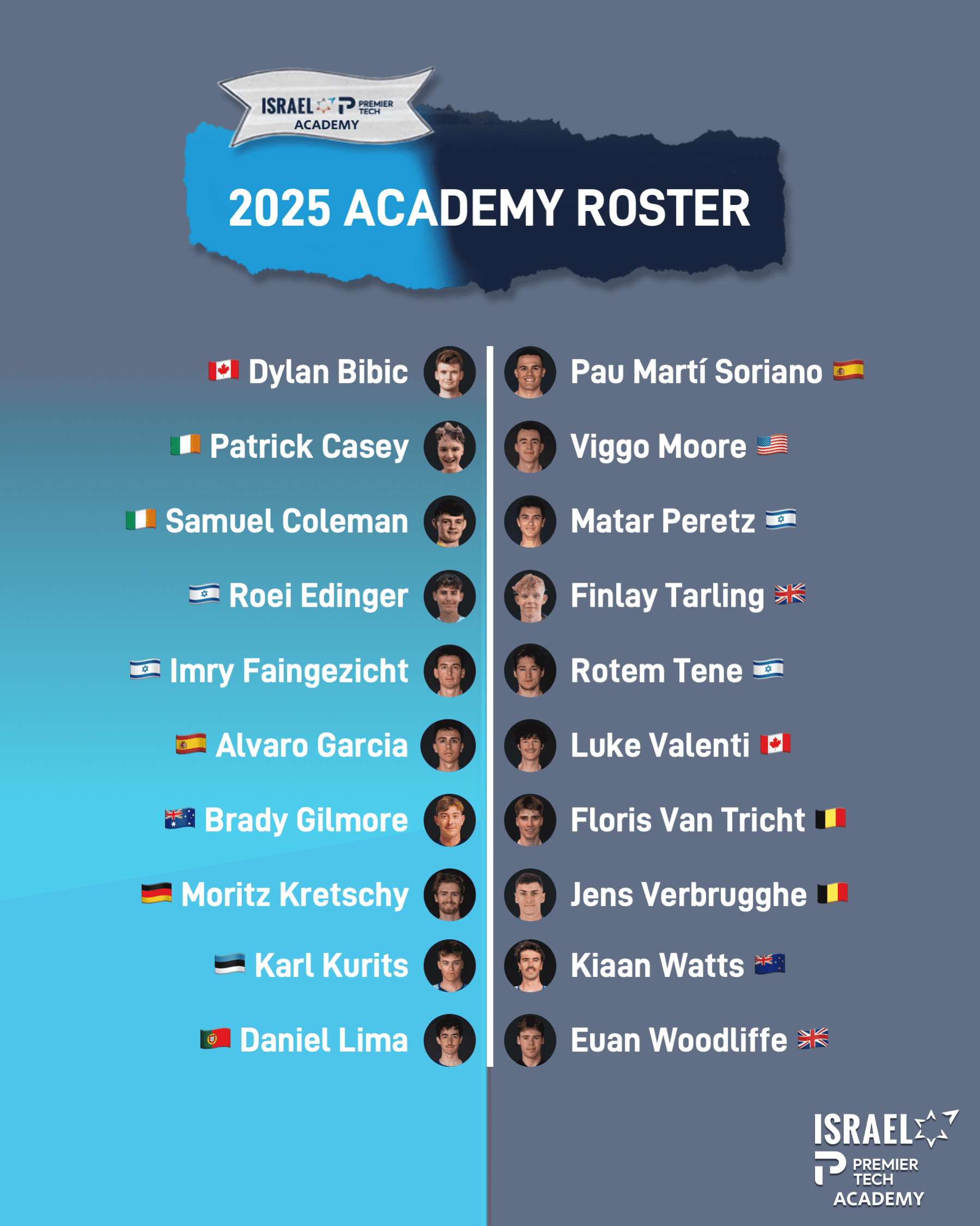 Israel – Premier Tech Academy in 2025: Dylan Bibic (CAN), Patrick Casey (IRL), Samuel Coleman (IRL), Roei Edinger (ISR), Imry Faingezicht (ISR), Alvaro Garcia (ESP), Brady Gilmore (AUS), Moritz Kretschy (GER), Karl Kurtis (EST), Daniel Lima (POR), Pau Martí Soriano (ESP), Viggo Moore (USA), Matar Peretz (ISR), Finlay Tarling (GBR), Rotem Tene (ISR), Luke Valenti (CAN), Floris Van Tricht (BEL), Jens Verbrugghe (BEL), Kiaan Watts (NZL), Euan Woodliffe (GBR)