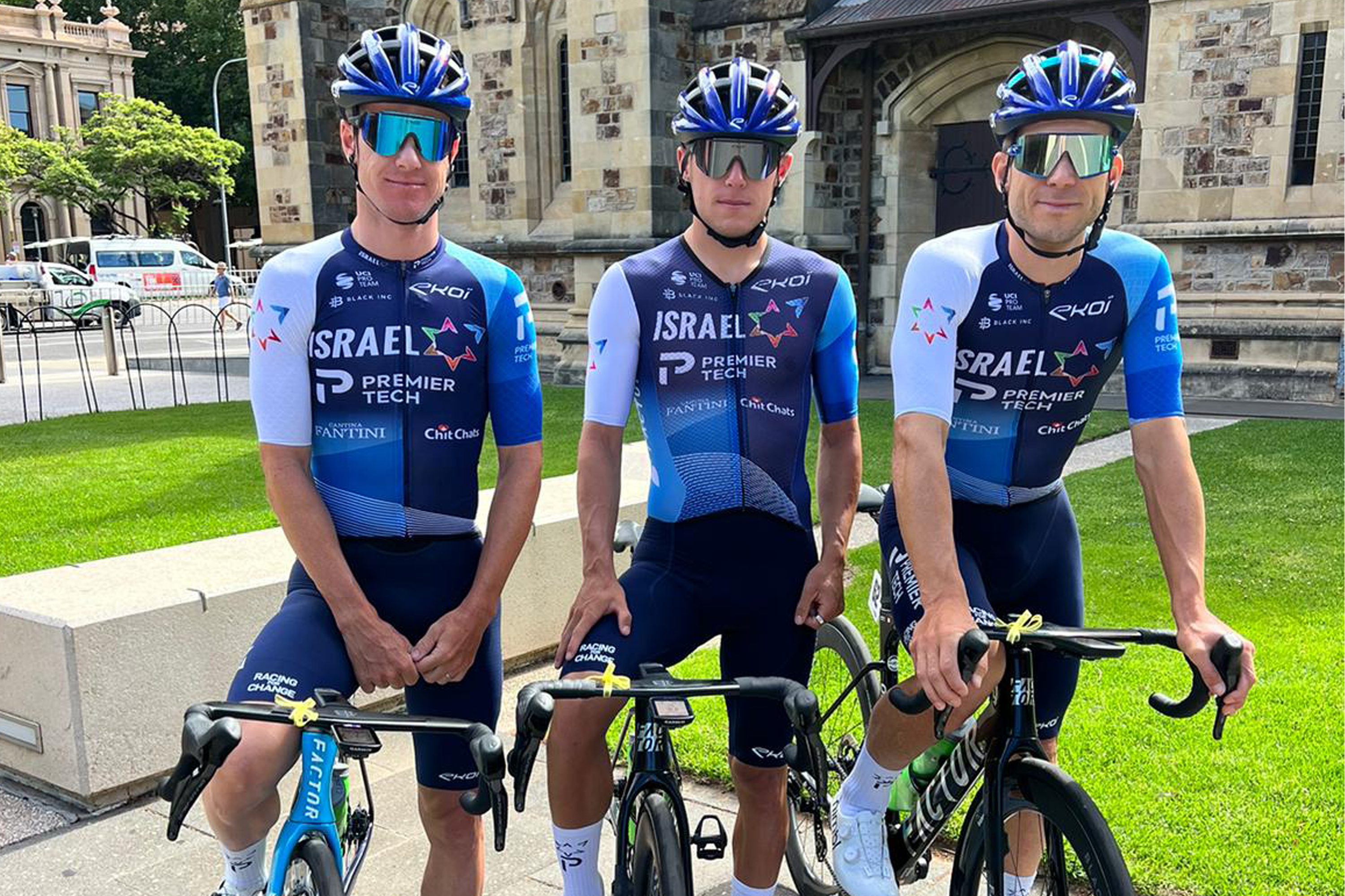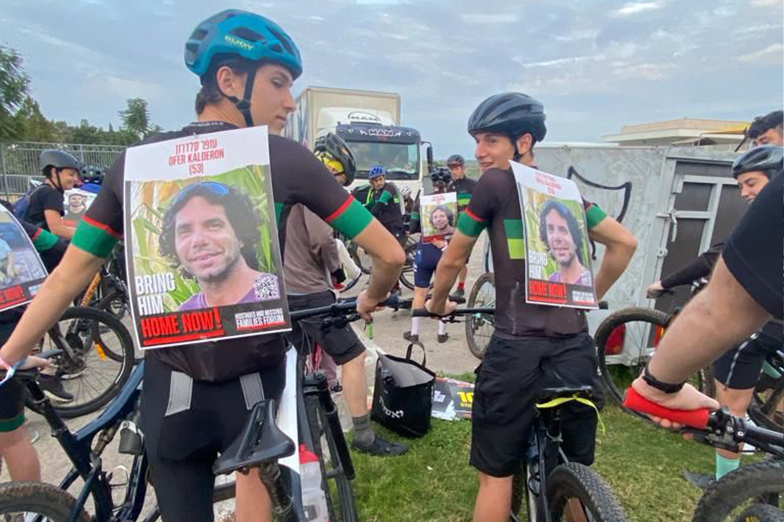 Israeli riders carrying the photo of kidnapped cyclist Ofer Kalderon on their backs